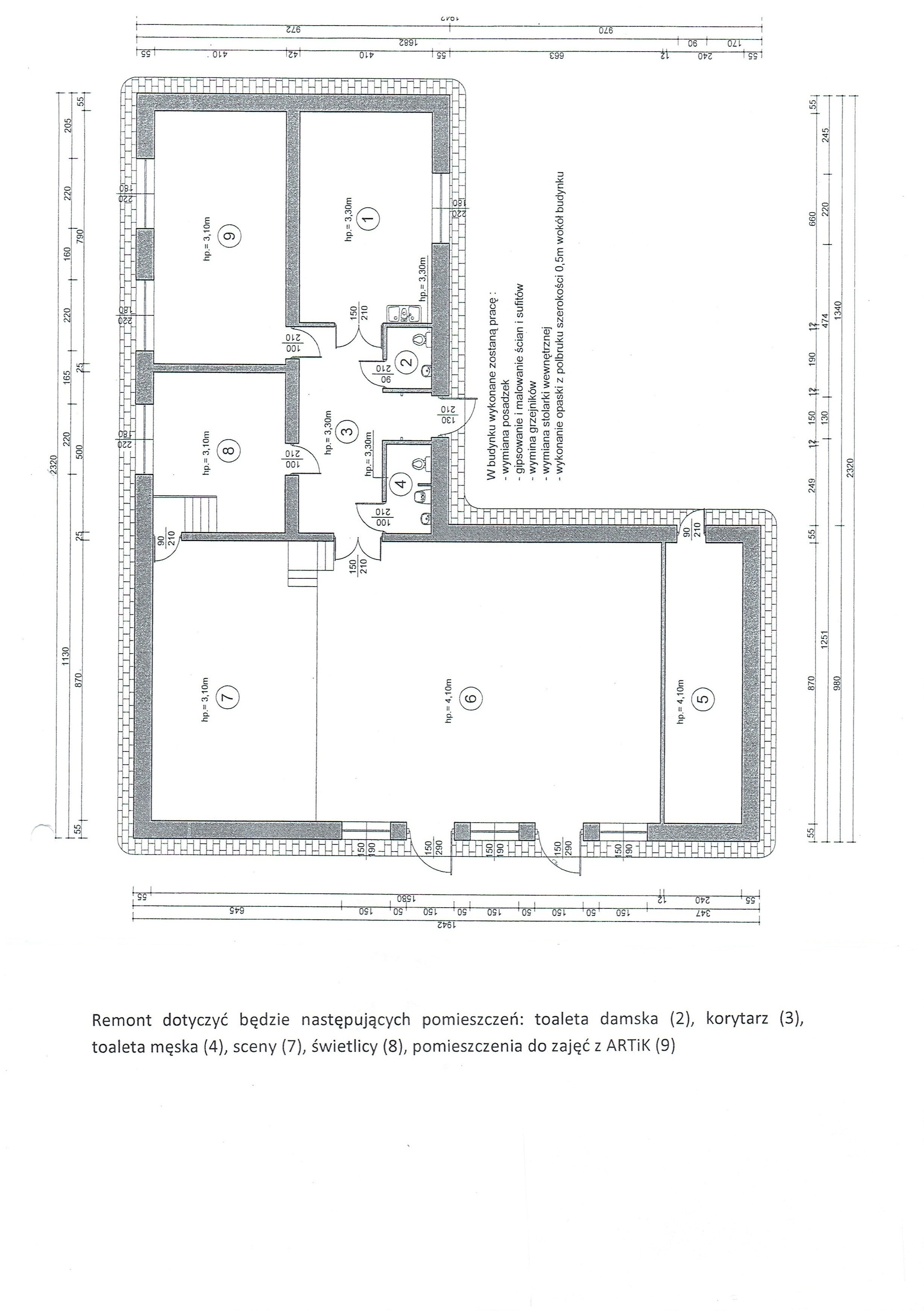 II.1.4) Określenie przedmiotu oraz wielkości lub zakresu zamówienia: Przedmiotem zamówienia jest remont Wiejskiego Ośrodka Kultury w Lutowie w zakresie: 1) Roboty rozbiórkowe: -rozebranie posadzki i wykładzin ściennych z płytek ceramicznych -zeskrobanie starej farby -rozebranie posadzek z paneli podłogowych -demontaż grzejników z rur żeliwnych -wykucie z muru ościeżnic drewnianych -demontaż urządzeń sanitarnych -rozebranie opaski betonowej wokół budynku -wywóz i utylizacja gruzu, wywóz złomu 2) Tynki, malowanie, glazura - ściany i sufity: -zagruntowanie ściain i sufitów pod gładzie gipsowe -gładzie gipsowe ścian i sufitów -dwukrotne malowanie ścian i stropów wraz z zagruntowaniem -mycie powierzchni pokrytej farbą olejną w korytarzu, dwukrotne malowanie farbą olejną -licowanie ścian płytkami ceramicznymi -montaż okładziny ściennej z paneli na podkonstrukcji - scena 3) Podłoża i posadzki: -wykonanie posadzki z płytek ceramicznych wraz z cokolikami w toaletach i świetlicy -wykonanie posadzki z paneli podłogowych wraz z listwami cokołowymi w pomieszczeniu ARTiK i na scenie -wykonanie posadzki z płytek ceramicznych w korytarzu na oczyszczonej posadzce z lastryko 4) Stolarka drzwiowa: -obsadzenie nowej stolarki drzwiowej -obsadzenie nowej stolarki okiennej - wewnętrznej - witryny 5) Montaż wyposażenie c.o. -zainstalowanie nowych grzejników stalowych, płytowych 6) Armatura i wyposażenie toalet: -montaż urządzeń sanitarnych -montaż wyposażenia toalet 7) Roboty zewnętrzne: -wykonanie opaski z kostki betonowej na podsypce piaskowej Zakresem prac remontowych podlegać będą następujące pomieszczenia: korytarz, świetlica, dwie toalety, pomieszczenie ARTiK, scena. Powierzchnie użytkowe pomieszczeń: Toalety: 6,63 m2 Świetlica: 16,58m2 ARTiK : 37,67m= m2 Scena: 44,73 m2 Korytarz: 18,48 m2 2.3.Przed wykonaniem zadania kolorystykę ścian, płytek, fug oraz ich układ należy uzgodnić z Zamawiającym. 2.4 Szczegółowy zakres robót określa dokumentacja projektowa stanowiąca załącznik Nr 6, specyfikacja techniczna wykonania i odbioru robót budowlanych stanowiąca załącznik Nr 7 oraz przedmiar robót stanowiący załącznik Nr 8 do niniejszej SIWZ. Uwaga: Jeżeli w SIWZ przy opisie przedmiotu zamówienia wskazana została nazwa producenta, znak towarowy, patent lub pochodzenie w stosunku do określonych materiałów, urządzeń, itp. Zamawiający wymaga, aby traktować takie wskazanie jako przykładowe i dopuszcza zastosowanie przy realizacji zamówienia materiałów, urządzeń, itp. równoważnych o parametrach nie gorszych niż wskazane przez Zamawiającego, które spełniają wymagania norm i przepisów oraz założone parametry projektowe. 2.5. Prace towarzyszące konieczne do uwzględnienia w cenie oferty: a) uporządkowanie terenu i przywrócenie do stanu pierwotnego; b) ubezpieczenie terenu budowy od następstw nieszczęśliwych wypadków oraz katastrof budowlanych, 2.6. Zamawiający zaleca aby każdy z wykonawców dokonał wizji lokalnej w miejscu budowy celem sprawdzenia warunków związanych z wykonaniem prac będących przedmiotem przetargu, a także uzyskania wszelkich dodatkowych informacji koniecznych do wyceny prac. Ryzyko rezygnacji z oględzin i wizji lokalnej obciąża Wykonawcę składającego ofertę - (osoba do kontaktu Małgorzata Senska - kierownik Wiejskiego Ośrodka Kultury w Lutowie - 695 884 375)..