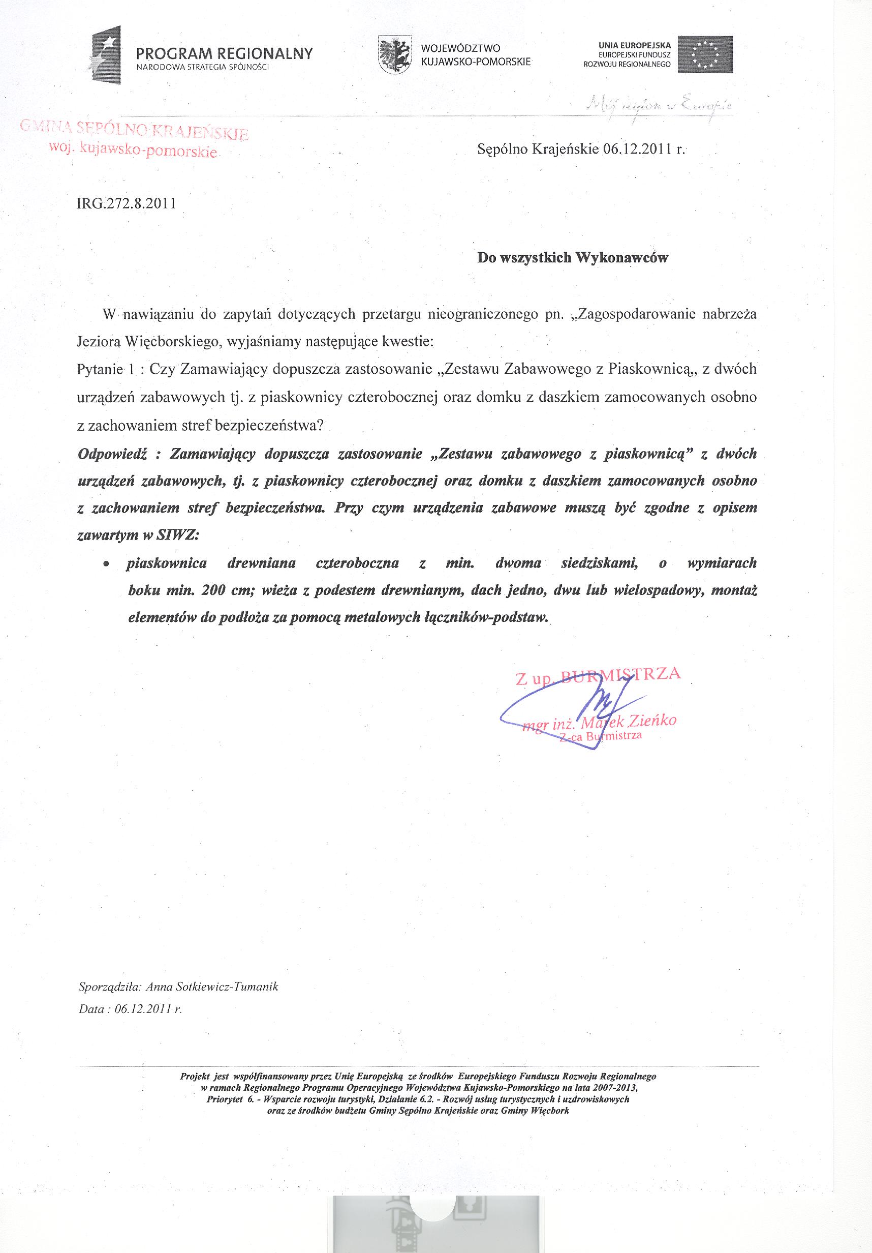 IV.4.16) Informacje dodatkowe, w tym dotyczące finansowania projektu/programu ze środków Unii Europejskiej: Projekt jest współfinansowany przez Unię Europejską ze środków Europejskiego Funduszu Rozwoju Regionalnego w ramach Regionalnego Programu Operacyjnego Województwa Kujawsko-Pomorskiego na lata 2007-2013, Priorytet 6. - Wsparcie rozwoju turystyki, Działanie 6.2. - Rozwój usług turystycznych i uzdrowiskowych oraz ze środków budżetu Gminy Sępólno Krajeńskie oraz Gminy Więcbork.
